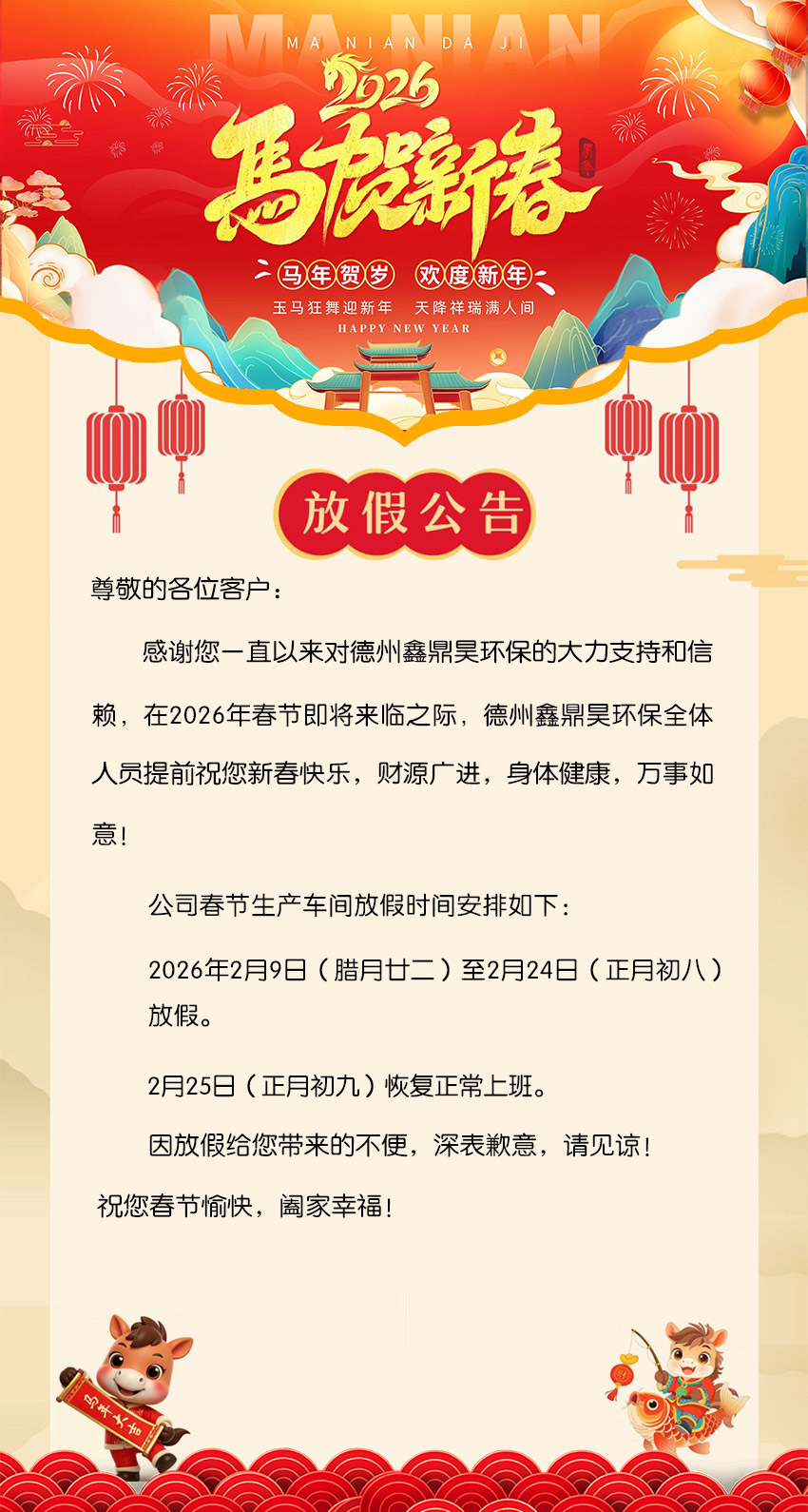 尊敬的各位客户: 感谢您一直以来对德州鑫鼎昊环保的大力支持和信赖,在2026年春节即将来临之际,德州鑫鼎昊环保全体人员提前祝您新春快乐,财源广进,身体健康,万事如意!