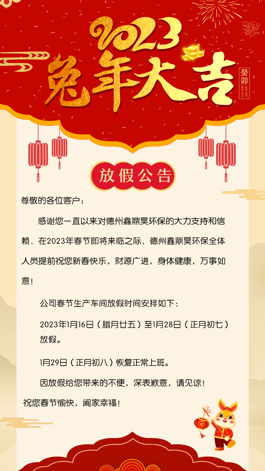 感谢您一直以来对德州鑫鼎昊环保的大力支持和信赖,在2023年春节即将来临之际,德州鑫鼎昊环保全体人员提前祝您新春快乐,财源广进,身体健康,万事如意!