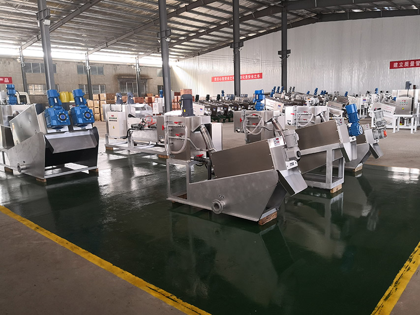 2、脱水:经过浓缩的污泥随着螺旋轴的转动不断往前移动;沿泥饼出口方向,螺旋轴的螺距逐渐变小,环与环之间的间隙也逐渐变小,螺旋腔的体积不断收缩;在出口处背压板的作用下,内压逐渐增强,在螺旋推动轴依次连续运转推动下,污泥中的水分受挤压排出,滤饼含固量不断升高, 终实现污泥的连续脱水。
